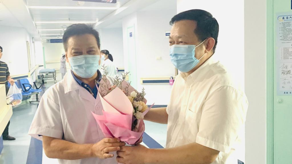 “节日快乐,你们辛苦了!”在医学院附属医院,乐传永慰问了正在专家门诊的“宁波市医师终身成就奖”获得者洪中立老院长、宁波市名医消化内科叶国良主任医师以及曾驰援武汉的感染科副主任医师赵克开、呼吸与危重症医学科主任医师马红映,向他们送上鲜花,致以节日的祝贺。