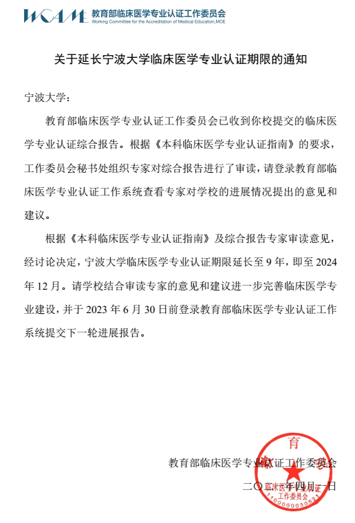 临床医学专业认证在有效期5年的基础上延长4年,是对我院临床医学专业办学工作的充分肯定,为我院进一步深化医学教育改革、不断提升人才培养质量发挥积极的推动作用。