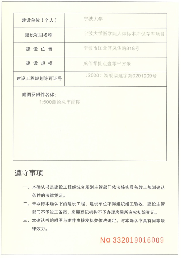 近日,医学院人体标本保存库项目通过规划验收,取得《浙江省建设工程规划核实确认书》。该项目于去年底竣工,该工程由宁波卓艺建筑装饰工程有限公司负责施工,宁波宁大建筑设计院有限公司设计,宁波宁大建设监理有限公司监理。