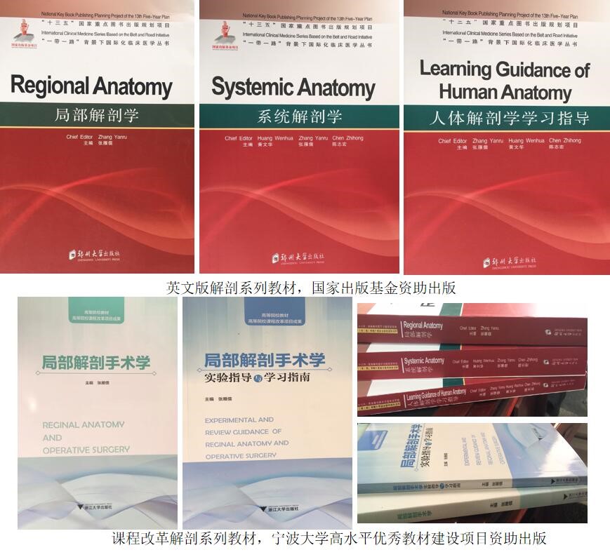 近日,医学院基础医学院解剖学张雁儒教授主编的解剖学系列教材获得出版。解剖学英文版系列教材《Systemic Anatomy》《Regional Anatomy》《Learning Guidance of Human Anatomy》入选“十三五”国家重点图书出版规划项目,获得国家出版基金项目资助,历时三年由郑州大学出版社正式出版。课程改革系列教材《局部解剖手术学》和《局部解剖手术学实验指导与复习指南》入选浙江省“十四五”普通高等教育规划教材并列入高等院校课程改革项目成果,同时获得杏吧视频 研究生高水平优秀教材建设项目立项资助,由浙江大学出版社正式出版。