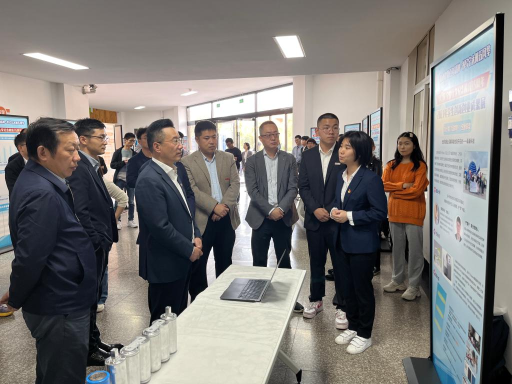 在展览上,朱达书记在医学院项目展板前驻足观看,并听取了团队成员吴佳奕同学关于团队建设、技术研发、地方合作、发展前景等相关情况的汇报。团队其他成员也分享了自己在创新创业过程中的收获与经验。