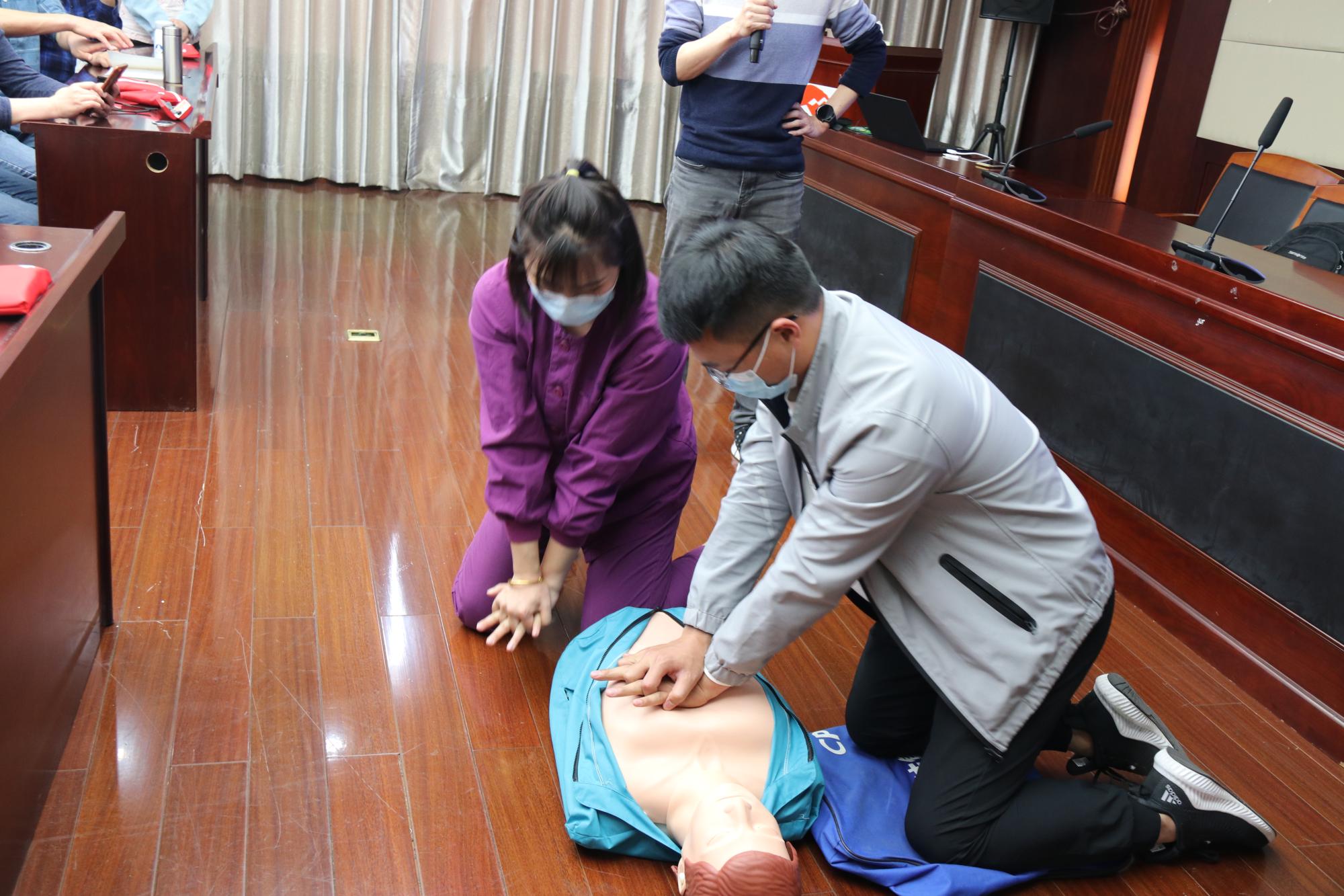 培训中,詹医生结合视频为大家生动解说和普及了创伤救护4项基本技术,即如何快速有效地止血、松紧适度地包扎、正确的骨折固定和准确无二次伤害的伤员搬运技术。根据学校实验室的特殊性,詹医生还介绍了实验室常见的烧烫伤、化学烧伤和异物插入的处理方法和原则。培训会同时开展了心肺复苏实地培训和演练,在韩涵楠护士的协教和讲解下,培训人员体验了现场心肺复苏的救治步骤和操作技巧,观摩学习了自动除颤仪的使用方法,并对模拟人进行了胸外心脏按压和人工呼吸的操作。