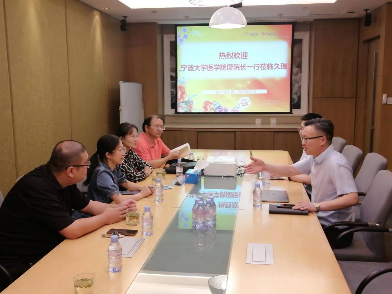 9月20日上午,医学院副院长廖奇等一行5人赴宁波久瑞生物工程有限公司访问交流。宁波久瑞生物工程有限公司总经理田金涛等接待了医学院一行。