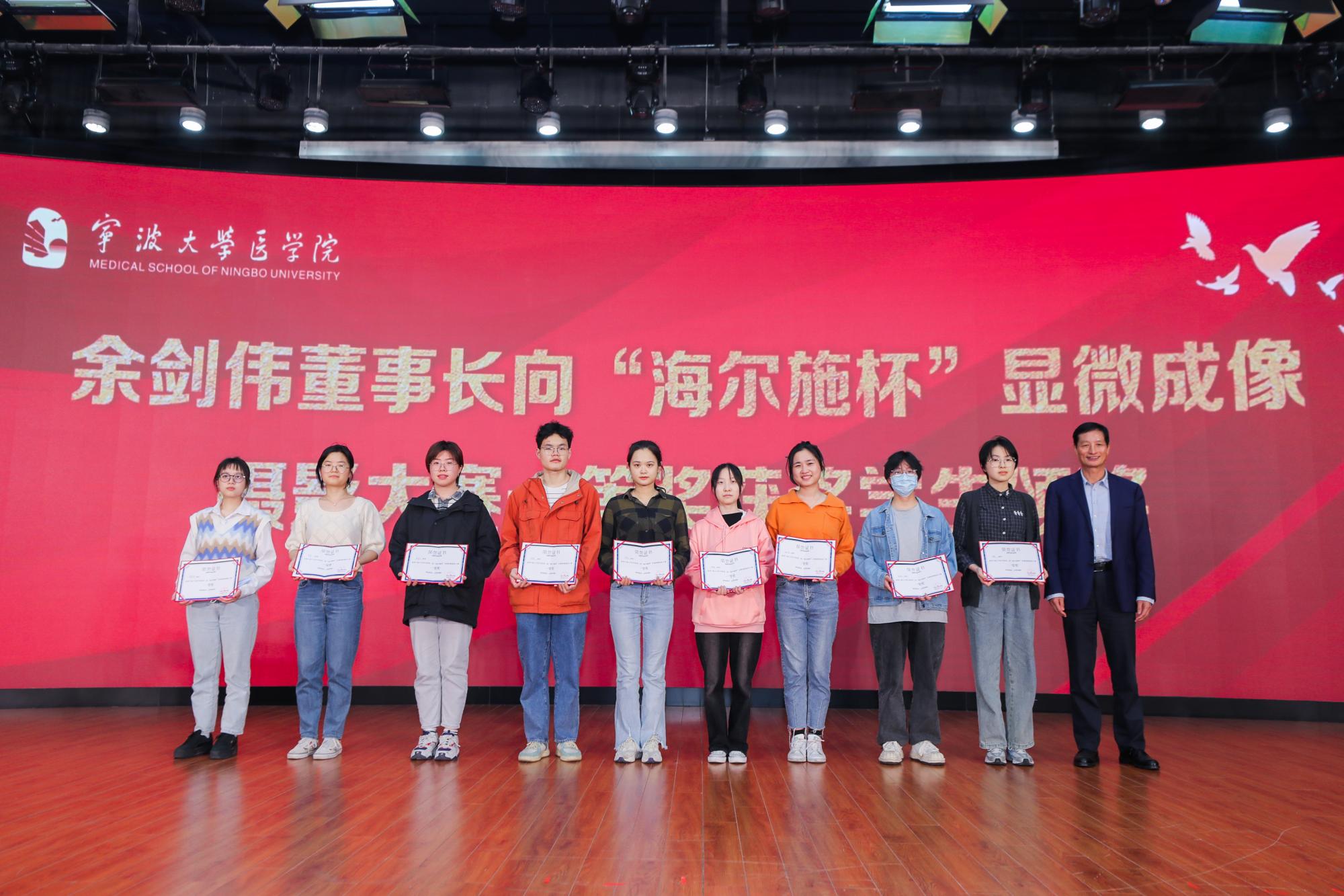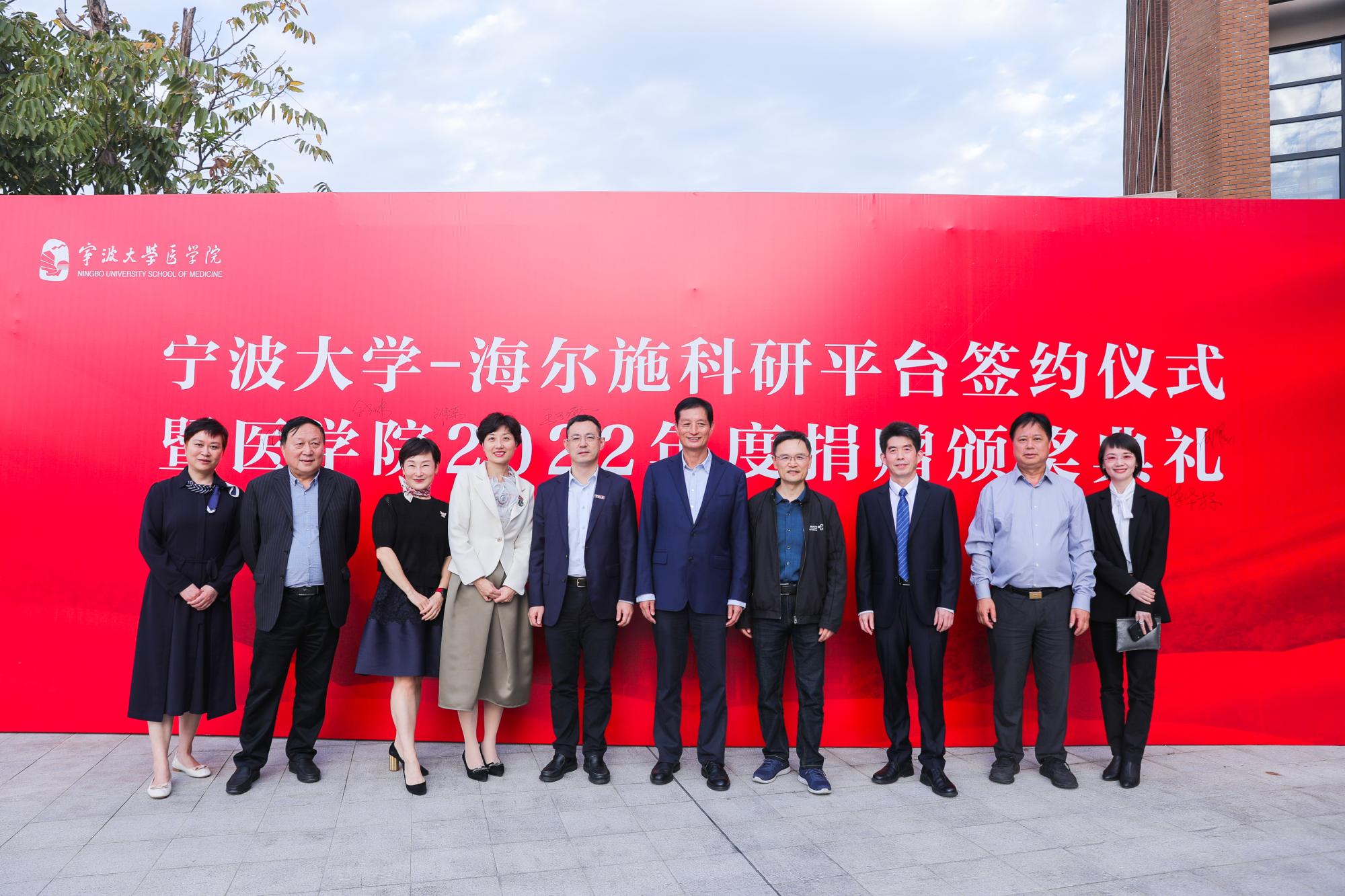 11月9日,杏吧视频 -海尔施科研平台签约仪式暨医学院2022年度捐赠颁奖典礼在真诚图书馆报告厅顺利举行。海尔施生物医药股份有限公司董事长余剑伟、副总裁王子瑜,香港江兴国际投资有限公司董事长江兴浩、宏达货运储柜有限责任公司董事长陆汉幸、宁波中营能源集团有限公司董事长刘康荣、舍力(宁波)供应链管理有限公司董事长何翟等嘉宾参加典礼、校党委副书记童晓晖出席典礼并讲话。