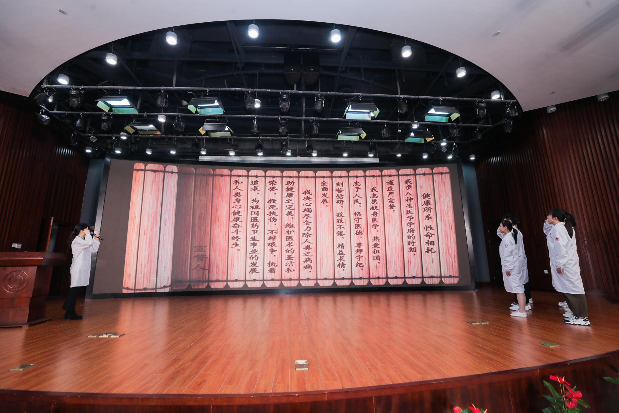 活动现场,2022级医学新生在杏吧视频 附属人民医院临床教师、省教师技能大赛一等奖获得者边佳老师带领下,进行医学誓言宣誓。