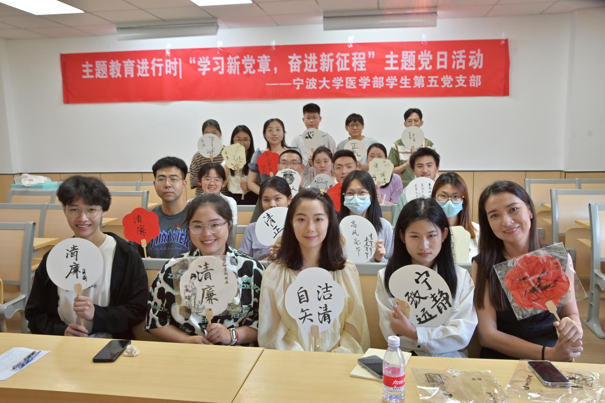 活动分为三个部分。第一部分“学习新党章,奋进新征程”,由支部书记古丽米热·买买提带领支部党员学习新党章,进一步推进学习贯彻党的二十大精神走深走实、入脑入心;第二部分“学习新理论,践行新思想”,全体党员学习《习近平关于调查研究论述摘编》并进行深入探讨交流,深刻体会“调查研究是我们党的传家宝,是做好各项工作的基本功”;第三部分“风清气正‘书’廉洁,青春践行二十大”,党员们在一把把宣纸扇面上紧扣清廉主题,通过各具特色的书法或风格迥异的绘画,用笔墨‘书’廉洁,以丹青扬清风。