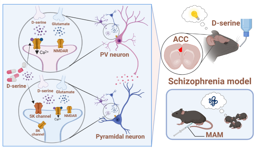 该研究首先揭示了D型丝氨酸激动NMDA受体对成年动物前扣带回神经元内在兴奋性的调节存在细胞特异性,尤是对于锥体神经元,NMDA受体激活可促进SK离子通道开放,从而抑制成年锥体神经元兴奋性。进而,通过建立精神分裂症神经发育障碍小鼠模型,发现D型丝氨酸一方面通过作用于前扣带回皮层的小清蛋白(Parvalbumin, PV)阳性神经元上的NMDA受体,激活PV阳性神经元,从而抑制周围的锥体神经元;另一方面,D型丝氨酸通过SK离子通道途径抑制锥体神经元内在兴奋性。以上两条途径共同作用调控前扣带回皮层神经微环路的兴奋/抑制平衡,改善认知功能。这项研究首次揭示了D型丝氨酸改善精神分裂症模型小鼠认知损伤的双重调控机制(图1)。