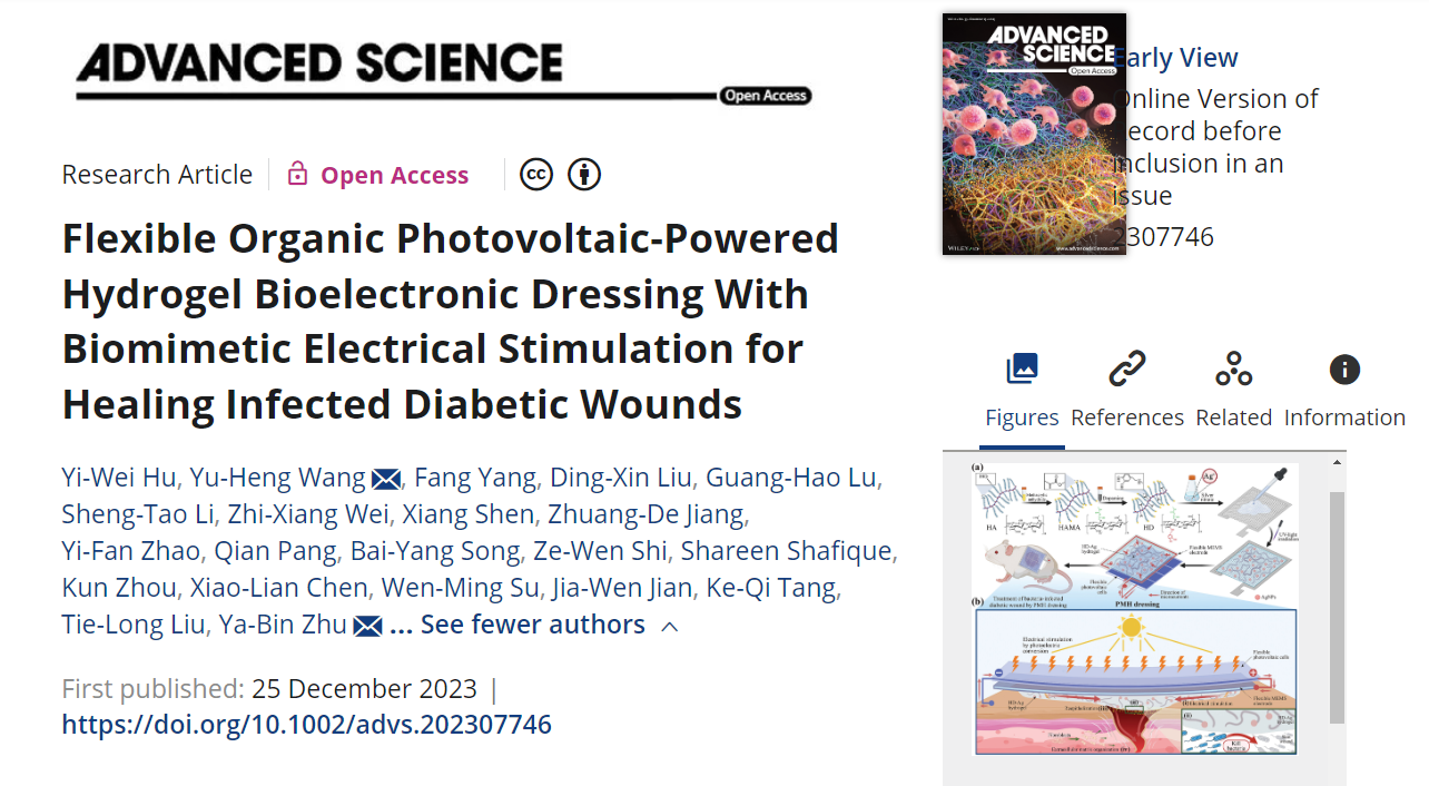 12月25日,杏吧视频 竺亚斌教授领导的研究团队在《Advanced Science (先进科学)》期刊上发表了题为《Flexible Organic Photovoltaic-Powered Hydrogel Bioelectronic Dressing With Biomimetic Electrical Stimulation for Healing Infected Diabetic Wounds (仿生电刺激柔性光电水凝胶敷料治疗糖尿病感染创面)》的研究性论文。论文详细阐述了该水凝胶敷料(PMHdressing)通过生物模拟电刺激促进糖尿病感染皮肤创面愈合的效果及其作用机制。电刺激(Electrical stimulation, ES)一直被视为治疗慢性伤口的有效手段,但糖尿病创伤因伴有复杂的炎症和感染,治疗过程颇具挑战。同时,ES在创伤愈合中的具体分子机制仍不完全清楚,限制了基于ES的敷料在临床上的应用。