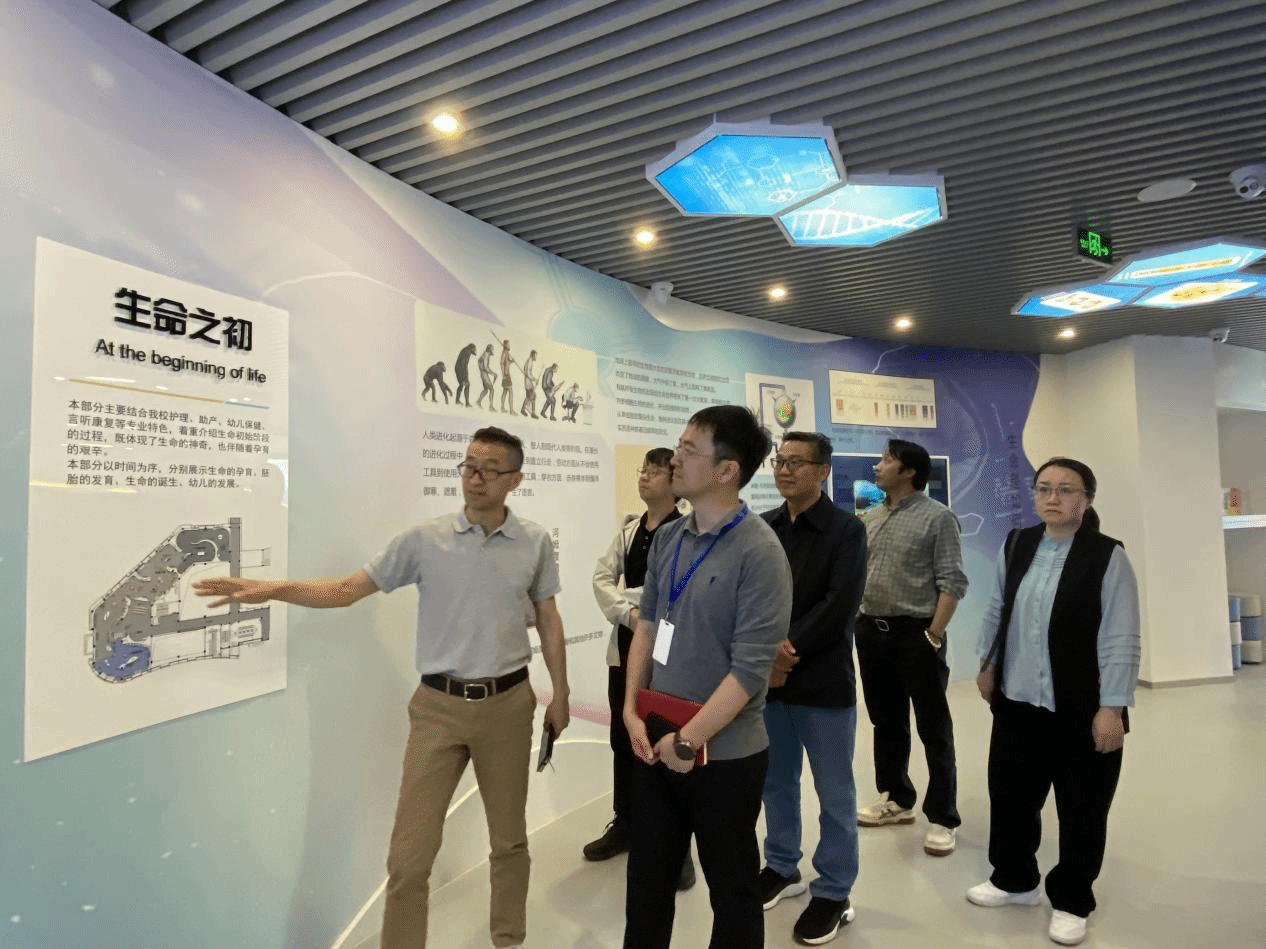 在宁波卫生职业技术学院基础医学教研室主任、人体生命科学馆副馆长曾斌的带领下,调研组一行实地参观了馆内的科普和专业两个展厅以及缅怀室、互动教室、实训室等,曾斌对设计的主题主线、标本的展示陈列、现代信息的应用及功能进行了详细介绍。