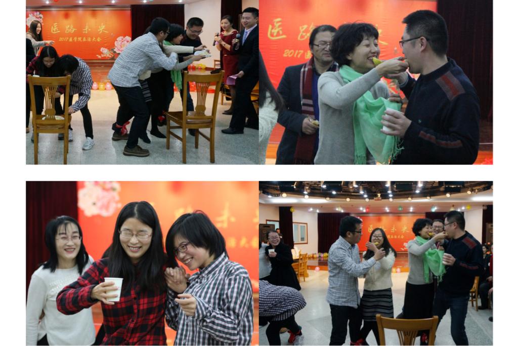 乐活大会以医学院分工会自制视频大片“医路未央”开场,以恢宏的气势,幽默诙谐的风格盘点了医学院的精彩而又忙碌的2016年,展示这一年“大家”的业绩、“小家”的变化,展现了全院师生在2016年抓住机遇,凝聚力量,在学院发展、校生命与健康学科群建设、医学中心建设、中港合作办学、中外合作建学科、岗位聘任、院党委和工会换届选举等各大事件中齐心协力、努力奋进的事件,同时又展现了全院教职工热爱生活,共建学院文化的风采,充满了浓浓的人文情怀。随后从院领导到各学科系、办公室各显神通,积极参与、展现才华为大家奉献出一个个高质量的欢乐大餐。全体院领导合演的小品《江南五大才子点如花》、各学科系主任合演的小品《爆笑新白娘子传奇》都是作品原创、笑料十足,院领导们和教授们以搞研究的态度搞笑,大大展示了幽默诙谐风采。各学科系展示的节目从舞蹈《真的没骗你》、《梦回汉唐》的华丽优美,到健身舞《向快乐出发》、《奔放的脚步》的活力四射,到语言类节目《我们的家》、《走在二胎的大道上》的欢乐风趣;加上摩登的学院新人秀,等无不结合了时下最流行的元素、最潮的语言和医学院的专业特色,聚集了大量教职工尽情地表演和参与,上下互动热烈,节目精彩纷呈,体现了医学院教职工劳逸结合、释放压力、凝心聚力、迎接挑战的精神风貌。此外,活动中还穿插了《我们都是木头人》、《神同步》等时尚而又有挑战的游戏,现场教职工参与热情高,现场一片欢声笑语,其乐融融。