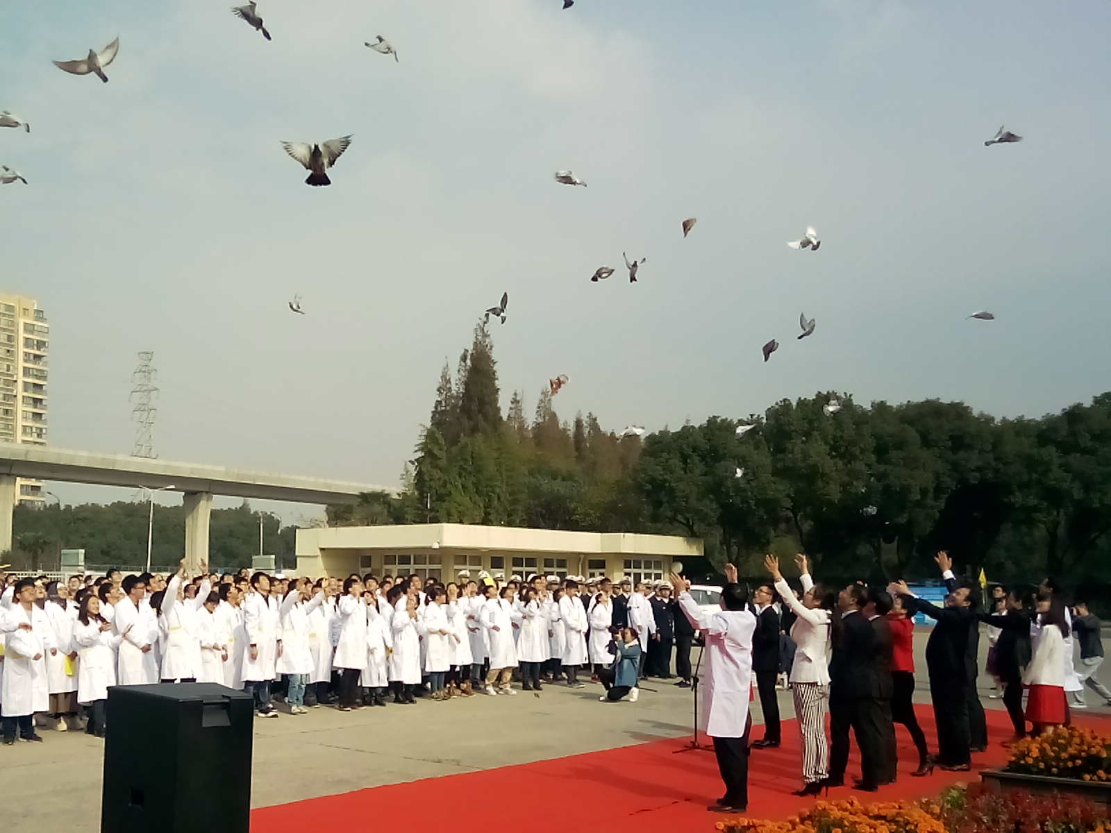周文华院长用中英文双语结合的方式发表了热情洋溢的讲话。他希望同学们既要传承“兼容并包,自强不息,务实创新,与时偕行”的宁大精神,更要牢记“博学守仁”的医学院院训,铭记医学生誓言仅仅是个开端。他告诫同学们要用汗水和聪明才智,掌握真才实学、防病、治病的真本领。他建议同学们养成自主学习的习惯,增强自觉性和独立生活能力,实现知识、能力和素质的全面提升。随着周院长“迎接挑战,放飞理想”的话音刚落,现场师生共同放飞梦想之鸽,现场一片欢腾。展翅高飞的白鸽象征着医学生怀揣远大理想,搏击长空,奋发有为,也预示着医学院正朝着高水平、有特色、国际化的目标不断迈进。