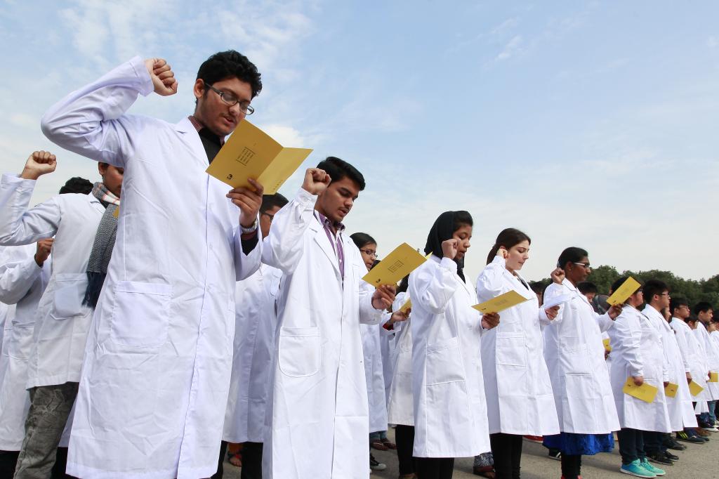 据了解,医学生宣誓仪式是医学院着眼于学生医德医风教育、人文素养提高开展的一项传统文化活动,至今已连续开展16年。随着学院国际化办学的推进,自2012年起,采用中英文双语模式进行。该活动是我校校园文化“一院一品”品牌项目,也是医学生在学业和职业生涯中的一场具有特殊意义的精神洗礼,为师生关注和称道。