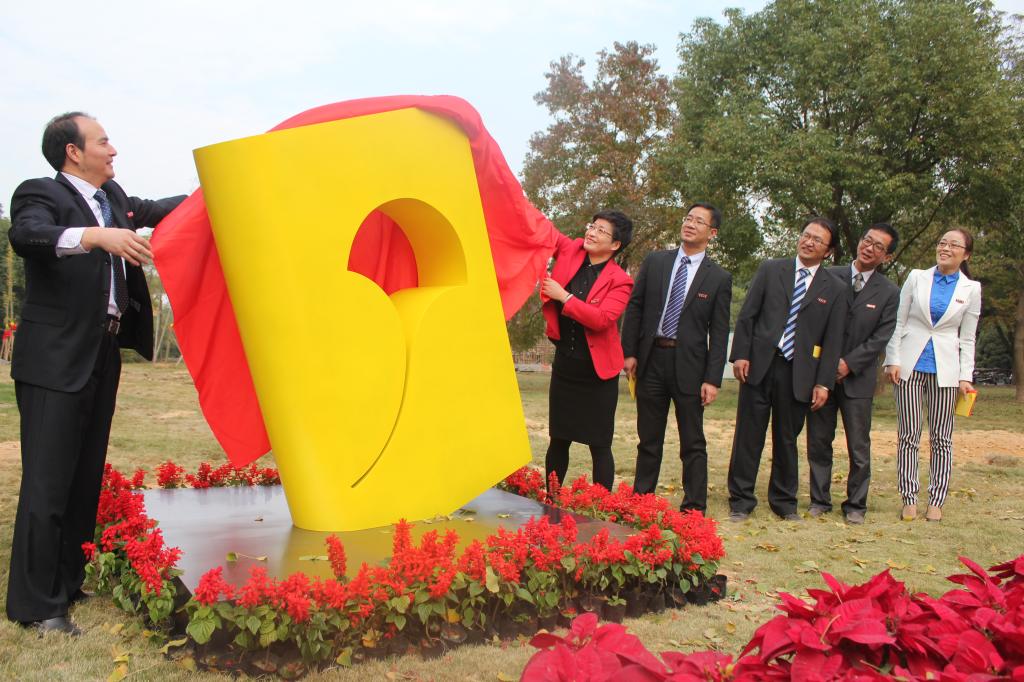 随后,医学院在王长来楼旁边的绿地举行了“杏林书香”杏林园揭碑仪式。一座融书籍和银杏叶片造型于一体的明黄色雕塑,精巧地点缀在杏林园中,该雕塑兼具人文医学和学院文化的气息,与周边一届届医学生栽种的银杏树相映成趣,构成了一幅“春俏叶缀林,秋实霜染天,明志杏成荫,翰墨书飘香”的美好画卷。周文华院长和骆巧凤书记为“杏林书香”主题雕塑揭幕,并与嘉宾、师生一道栽种银杏树,14级新生以班级为单位种下的银杏树在秋日的暖阳中迎风摇曳,充满生机。