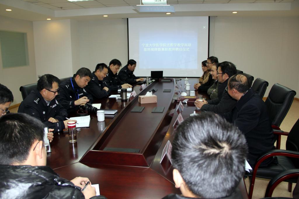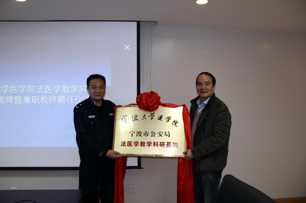 1月22日下午,我校与宁波市公安局刑事科学技术研究所建立法医学教学科研基地授牌和兼职教师聘任仪式在宁波市公安局刑事科学技术研究所举行。市公安局刑事科学技术研究所所长叶成立,医学院执行院长周文华出席仪式并讲话。市公安局刑事科学技术研究所相关人员、医学院相关负责人等参加了仪式。