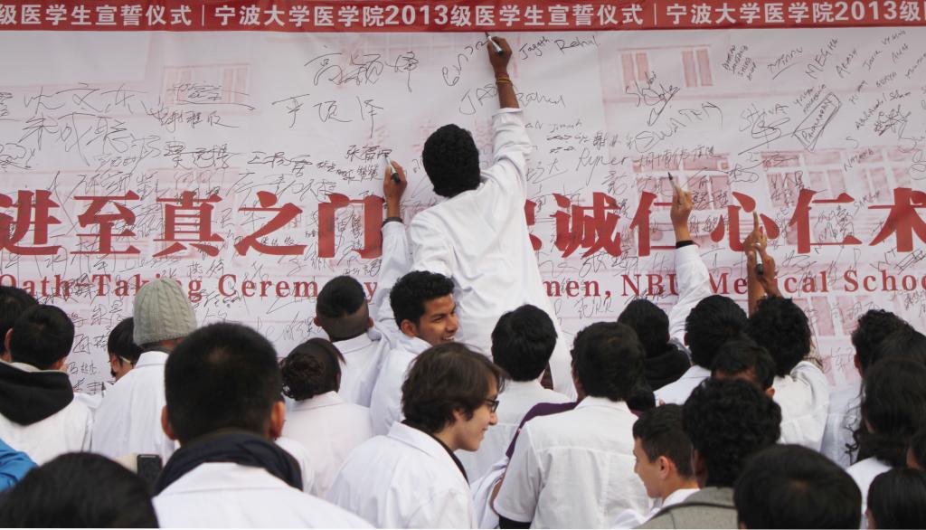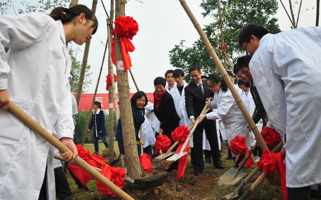 在师生齐唱《杏吧视频 医学院院歌》的昂扬歌声中,现场领导嘉宾为新生代表授予白大褂。全体医学生身着圣洁的白大褂,在医学院王钦文副院长的带领下,进行了庄严的宣誓,郑重地把“健康所系、生命相托”的神圣使命担在肩上,立志做有担当的新一代医学生。教师代表刘爱明博士,医学院首届毕业生、鄞州人民医院心内科医生赵乾磊,以及新生代表顾凯波、留学生新生代表Ahmad Harb,围绕“当我第一次穿上白大褂”进行了主题演讲。师长结合自身的经历、现代医学的发展和当前医疗环境的变化,与同学们分享了各自的“白衣情结”,鼓励大家珍惜时间懂得爱,鞭策同学们无论何时何地都要坚守自己的誓言,坚守生命和健康。在“杏林寄语”环节,国际合作处陈玉涓处长、医学院骆巧凤书记、孙欢欢副书记等领导嘉宾为2013级中外新生送上了深切的勉励和祝福。医学院徐雷艇副院长发表了热情洋溢的讲话,他希望同学们既要传承“兼容并包,自强不息,务实创新,与时偕行”的宁波精神,更要牢记“博学守仁”的院训,勉励广大医学生要担任起捍卫人类健康和生命的职责,铭记医学生誓言,努力学习理论知识和专业技能,做到真才实学,实现知识、能力、素质的全面提升。最后,全体领导嘉宾来到王长来楼东侧草坪,和各班学生代表一起植下象征医学界的银杏树,并埋下寓意希望和理想的时间囊,共同培植“杏林明志,医话青春”的梦想。