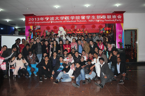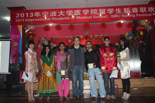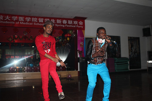 2月4日下午,锦绣活动中心多功能厅张灯结彩,欢声笑语,一片喜庆祥和的新年气氛。2013年医学院留学生春节联欢会在这里举行。医学院执行院长周文华、党委书记骆巧凤、副院长徐雷艇、党委副书记孙欢欢、院长助理朱剑琼及学院部分教授、老师和140余名留学生参加了联欢活动。