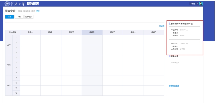 请同学务必登录网上办事大厅中的“我的课表”APP应用进行选课情况的检查。没有安排时间、教室地点的课程会出现在同学课表的最右边,也是同学已经选课的课程。(见下图红框内)