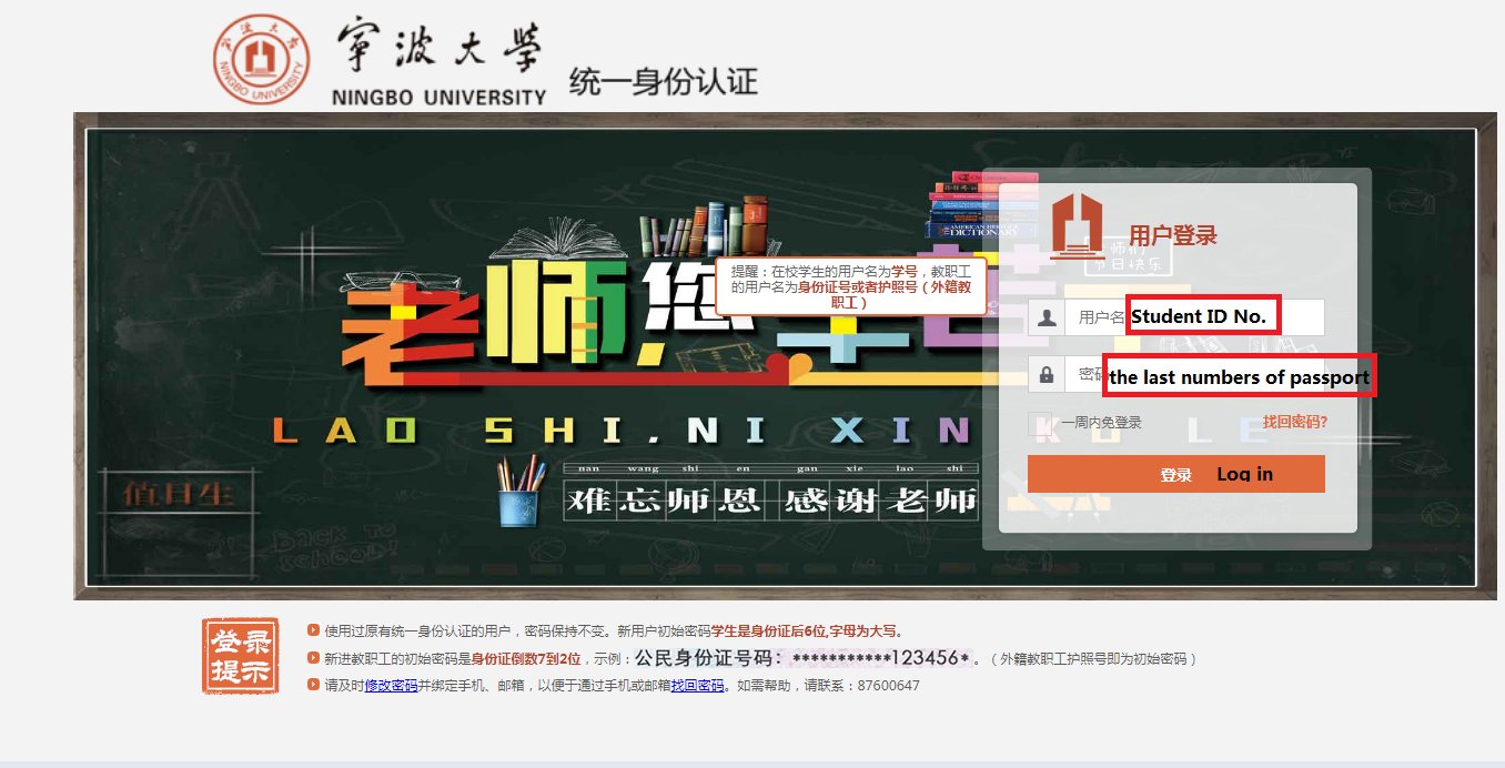 Step2. Type in your Student ID Number. and password (the initial password is the last six munbers of your Passport Number).