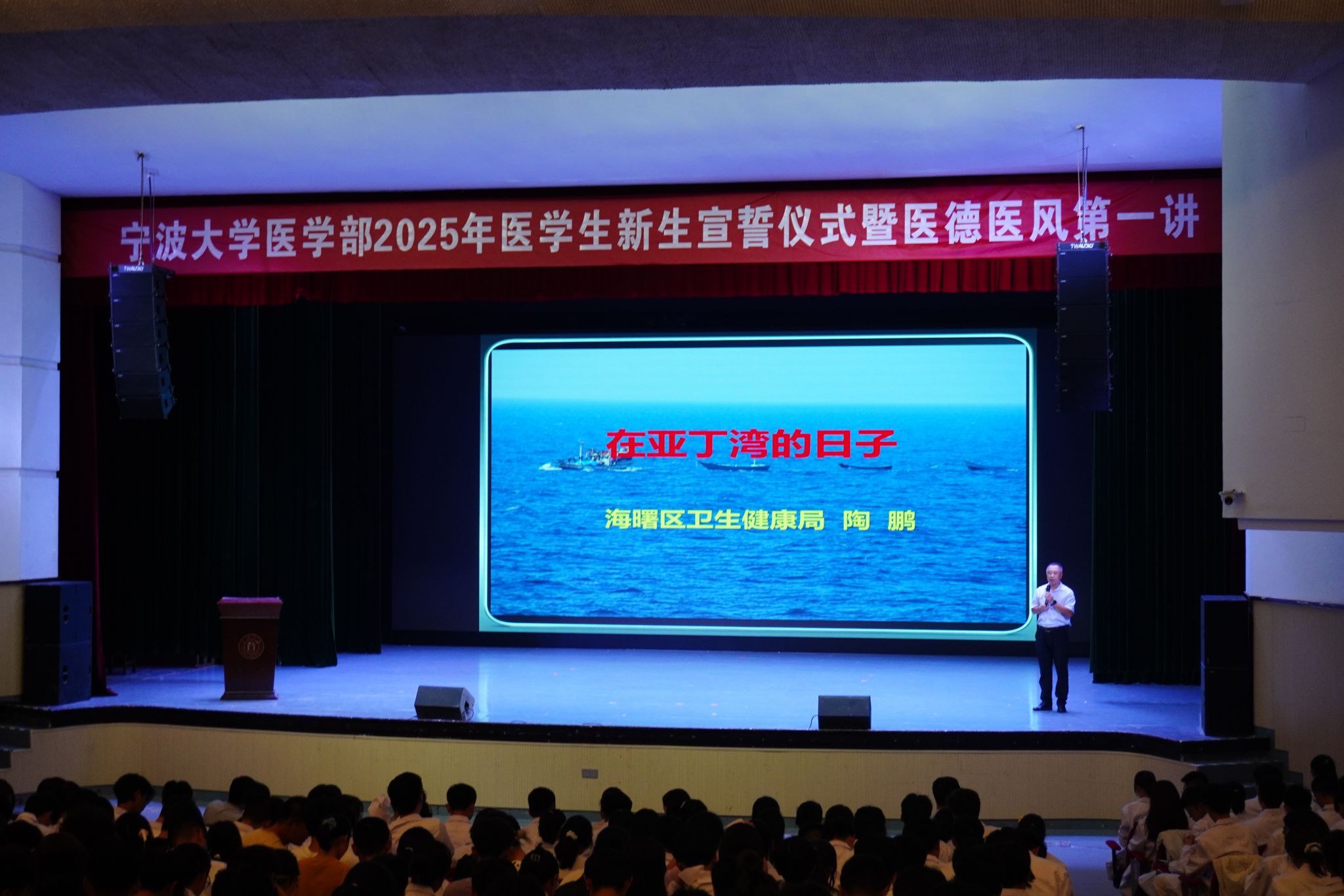 In the subsequent "First Lecture on Medical Ethics and Professional Conduct," part of the Apricot Forest Culture Festival, Tao Peng, Member of the Party Committee of the Haishu District Health Bureau, was invited to deliver a themed report titled "Days in the Gulf of Aden." He shared his special experience of traveling to the Gulf of Aden to carry out medical missions. Drawing from his personal experience, he recounted touching stories of holding fast to their posts and fulfilling military duties in arduous conditions. He emphasized the optimism forged through the trials of monotony and pressure, a deep-seated patriotic sentiment, and the international humanitarian spirit demonstrated during cross-border escort missions. Reflecting on those special years, Tao Peng expressed ardent expectations for the freshmen: to carry forward the patriotic spirit, diligently study medical knowledge, actively cultivate comprehensive qualities, continuously enhance their capacity to serve, and always uphold benevolence and courageously shoulder their mission on their future medical paths.