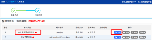 2.1 完善“人才服务”中的“人员信息”、“教育经历”及附件中的“本人手写签名扫描件”(电子签名)。