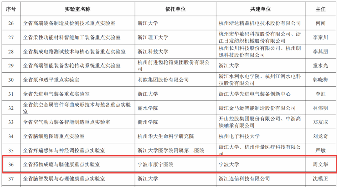 The Department of Science and Technology of Zhejiang Province recently issued the "Notice on the Recognition Results of 2024 Provincial Key Laboratories," featuring the Provincial Key Laboratory of Drug Addiction and Brain Health jointly established by Ningbo University and its affiliated Kangning Hospital. This marks the sole recognized provincial key laboratory in Ningbo's life and health sector within this batch.